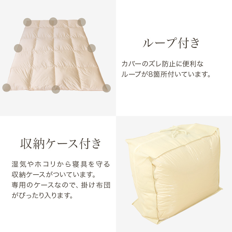 仕様:ループ8ヶ所、ダウンプルーフ加工、襟マル仕様、収納ケース付