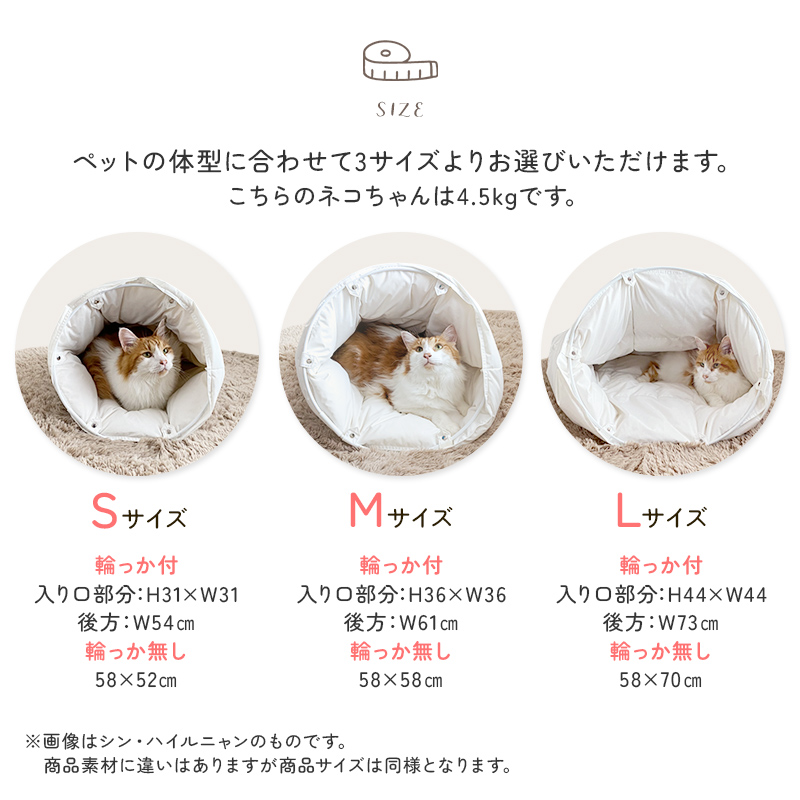 サイズ:(S)輪っか付 入り口部分31×31cm 後方54cm 輪っか無し58×52cm (M)輪っか付 入り口部分36×36cm 後方61cm 輪っか無し58×58cm (L)輪っか付 入り口部分44×44cm 後方73cm 輪っか無し58×70cm