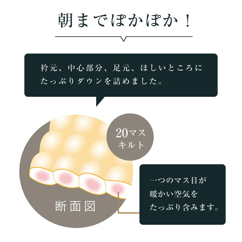 仕様:ループ8ヶ所、ダウンプルーフ加工、立体キルト、7年保証